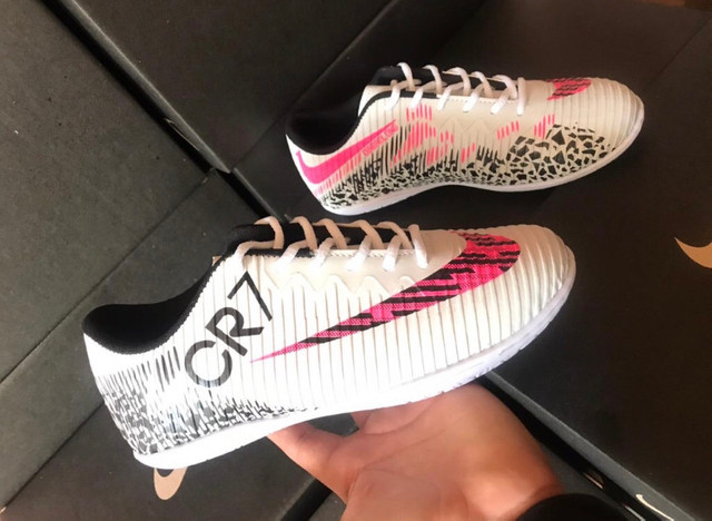 Uncategorized Chuteira Cr7 Branca O modelo possui um padr o inspirado em diamantes em uma base branca que brilha sob as luzes